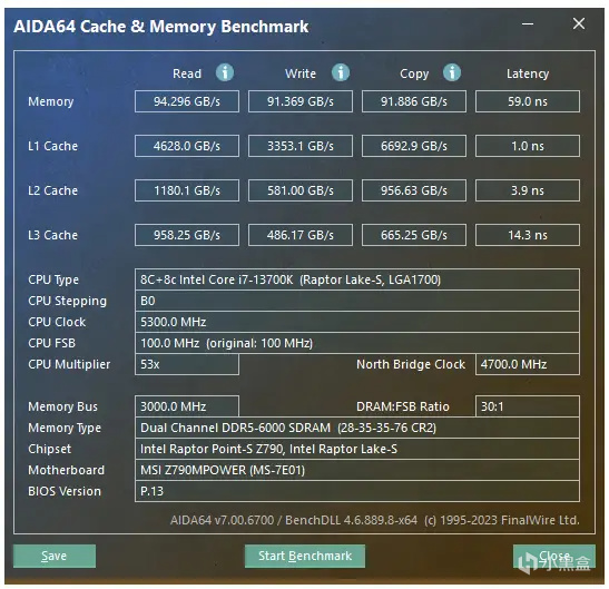 開啓XMP後,AIDA64實測性能提升很明顯,讀取速度爲94.296GB/s,寫入速度爲91.369GB/s,複製速度爲91.886GB/s,延遲爲59ns。