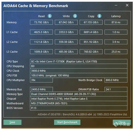 默認4800MHz AIDA64實測,讀取速度爲73.792GB/s,寫入速度爲67.042GB/s,複製速度爲67.155GB/s,延遲爲87.6ns。