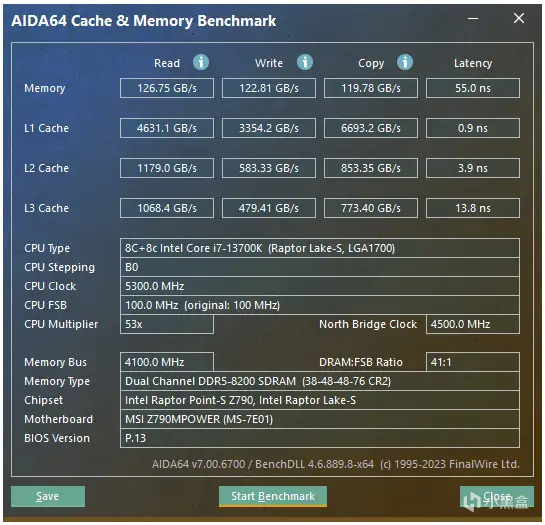要說金百達星刃DDR5內存的頻率極限是多少,我實測可以達到8200MHz,時序爲38-48-48-76。這時候AIDA64測試出讀取速度爲126.75GB/s,寫入速度爲122.81GB/s,複製速度爲119.78GB/s,延遲爲55ns。