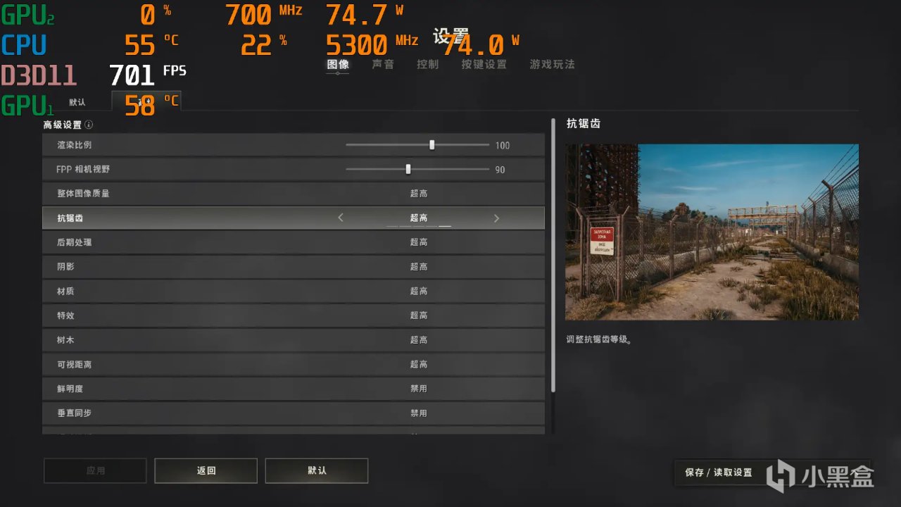 比如《絕地求生》畫面設置爲2K分辨率+100%渲染+超高整體圖像質量。