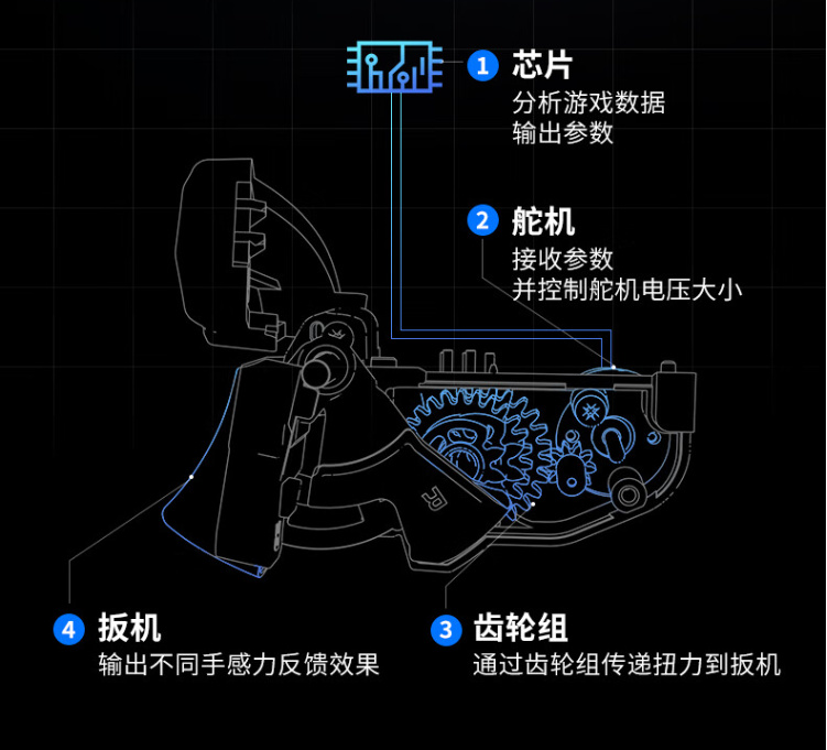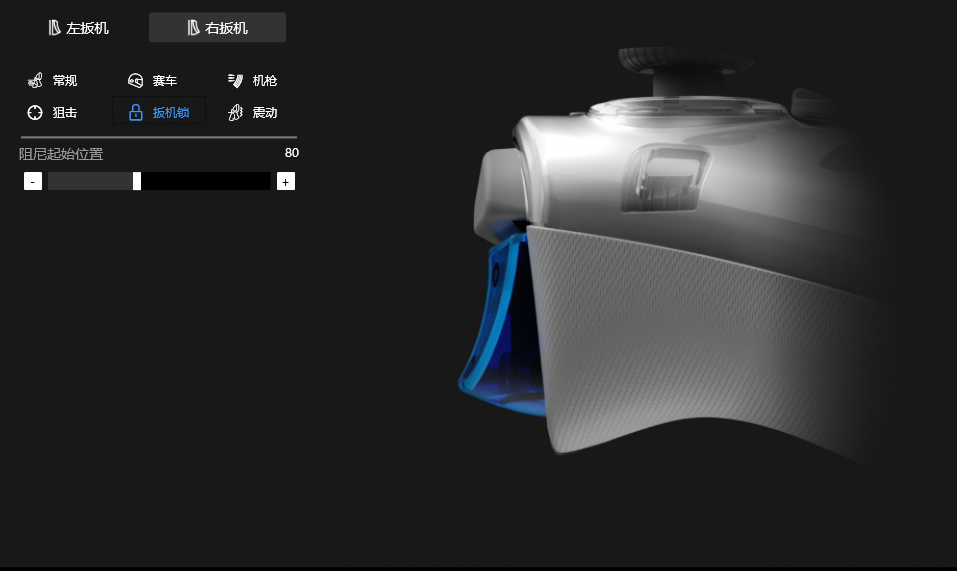 下圖的右扳機位置爲該模式。這個模式是通過調節扳機的阻尼力度以模仿賽車的油門,不得不說,增加了阻尼之後按壓的感覺非常真實,配合扳機震動,使得遊戲的沉浸感非常強!