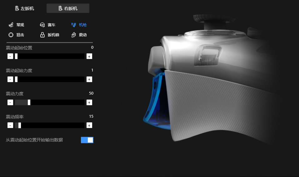 機槍模式主要就是通過調整手柄的扳機震動去模擬真實機槍的射擊過程,動圖的左扳機位置爲該模式下,能看到該模式下扳機的遞增是有波動的,會隨着震動有一定回彈。