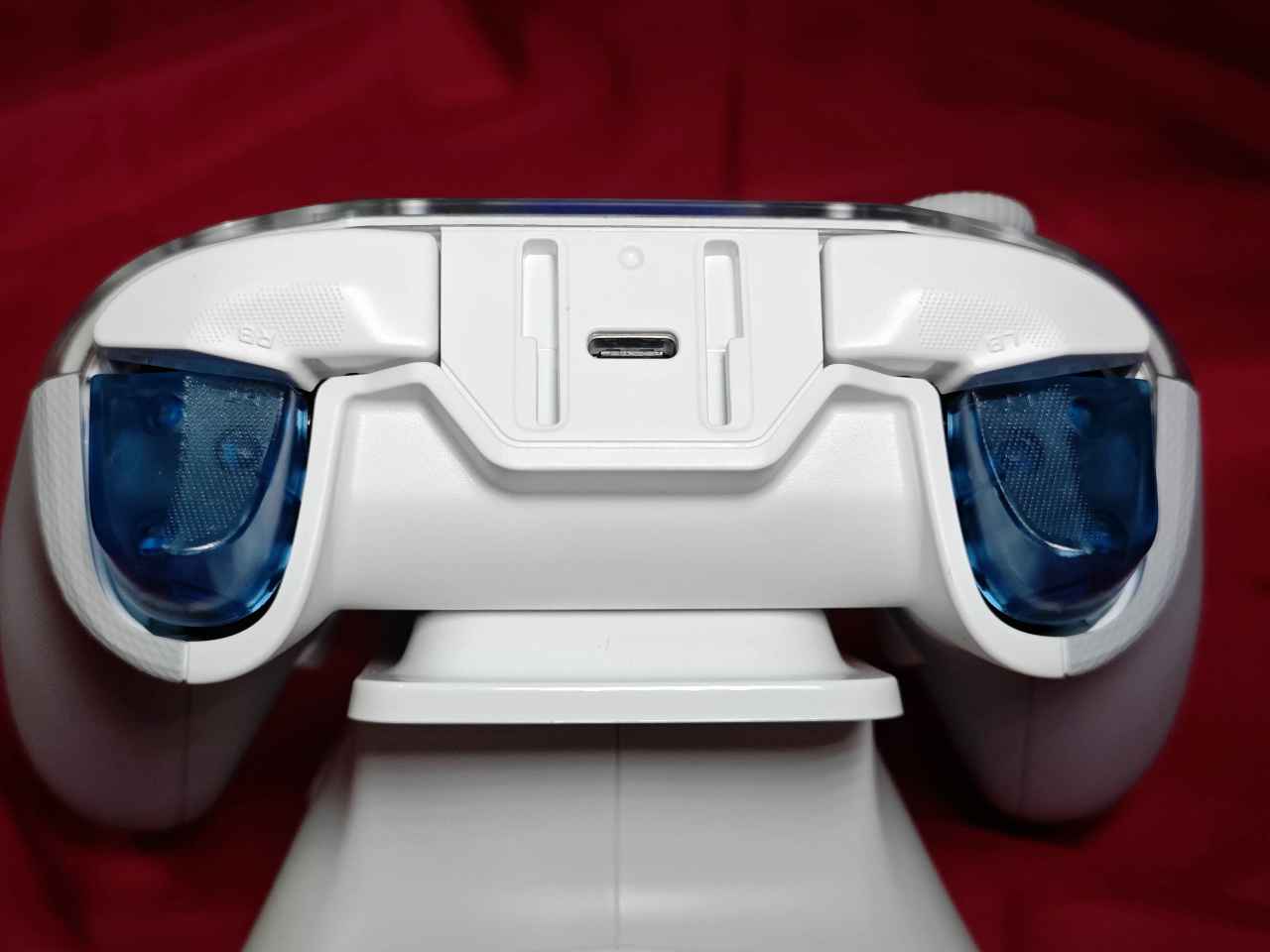 84的肩鍵爲輕觸按鍵類型,S型的肩鍵設計,按鍵的一致性很好,觸發迅速,回彈快,還帶有防滑紋理,設計非常貼心。扳機爲力反饋扳機,這個我們等下再着重介紹。中間還有一個type-c的充電口及手機底座的卡槽位。