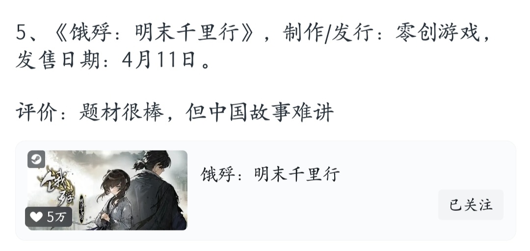 總而言之呢,我是非常期待《餓殍:明末千里行》的,用遊戲展現真實歷史,講述不一樣的中國故事。