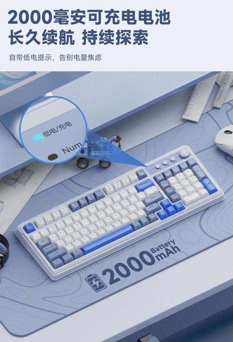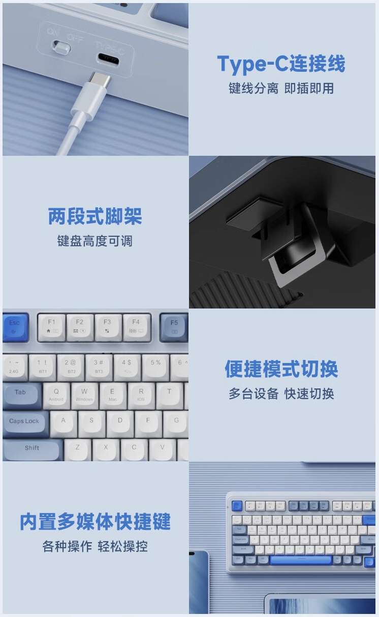 此外,这款键盘配备两段式脚架,内置多媒体快捷键,配备 2000 毫安可充电电池,自带低电提示。