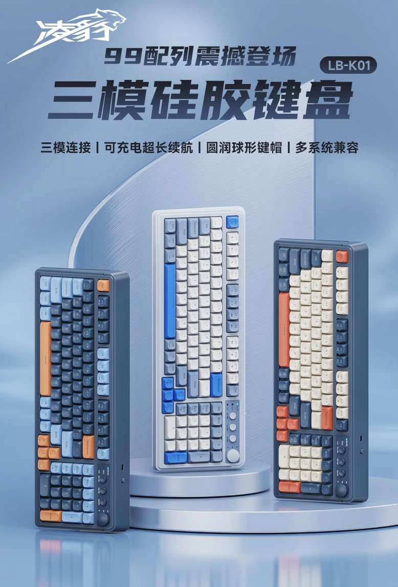 凌豹今天在京东上架 K01 三模键盘,这款键盘采用 99 键配列布局,19 键无冲,支持连接 5 台设备,首发价 89 元。