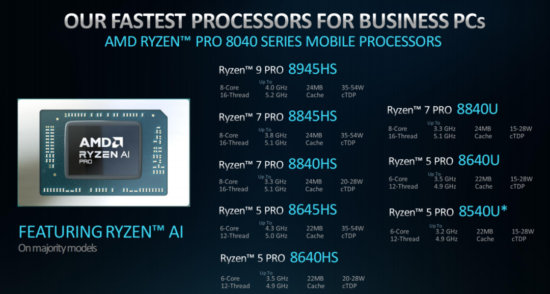 從圖中可以看到,銳龍PRO 8040系列型號其實與消費級平臺銳龍8040系列的核心數、頻率設定基本對應,都包括了9、7、5三個級別。不過值得注意的是,其中的銳龍PRO 8045HS系列功率設定爲35W~54W,可以提供更強的性能,而銳龍PRO 8040HS系列功率設定則爲20W~28W,適合對續航和能效比要求更高的性能級輕薄本。銳龍PRO 8040U系列功率設定則爲15W~28W,面向追求極致能效比的輕薄本。