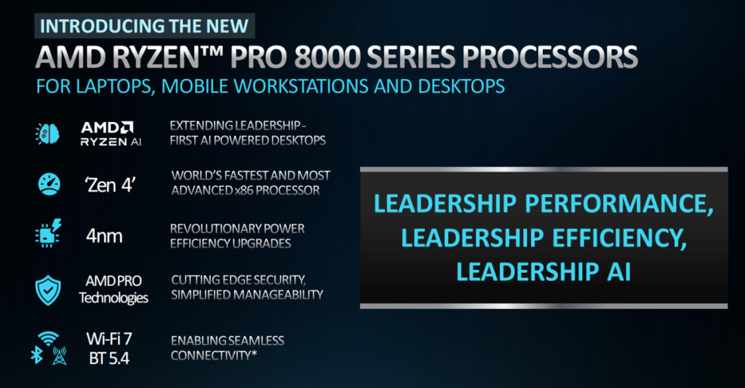 銳龍PRO 8000/8040系列全面內置Ryzen AI引擎,率先將商用PC帶進了AI時代;處理器採用Zen4高效架構和4nm先進製程,提供強勁的性能和高能效比;AMD PRO技術則爲企業用戶帶來了最尖端的安全保障,同時也提供了更易用的管理功能。此外,銳龍PRO 8000/8040平臺也會全面提供對WIFI 7和藍牙5.4的支持,爲用戶提供更好的使用體驗。