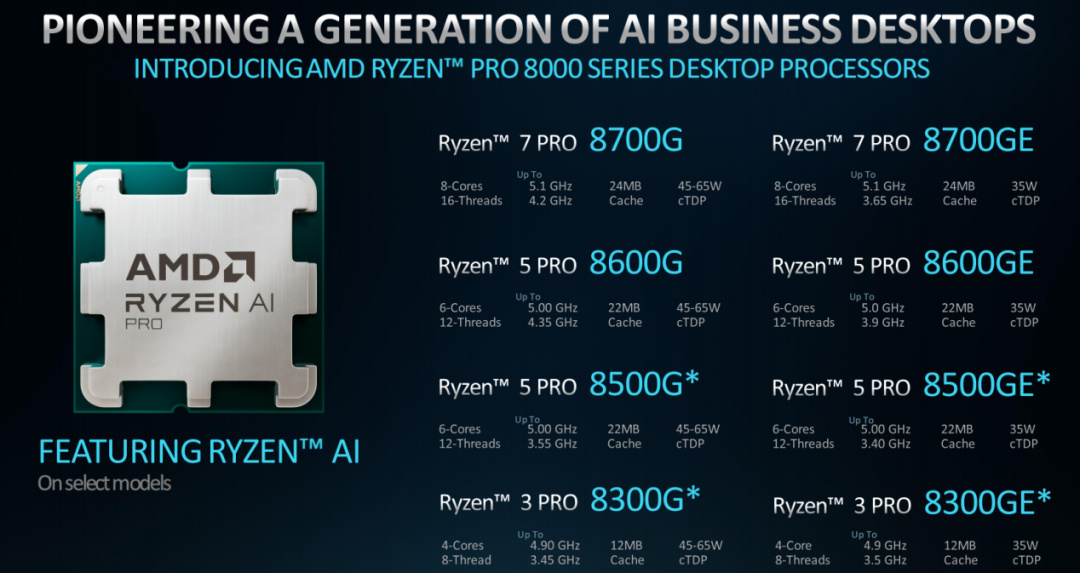商用臺式機方面,銳龍PRO 8000系列可以說是相當搶眼了。之前AMD已經發布了面向消費級市場的銳龍8000G系列,而銳龍PRO 8000系列在此基礎上還增加了更多的型號。從圖中可以看到,銳龍PRO 8000系列除了8700G/8600G/8500G/8300G這幾款TDP爲45W~65W的型號之外,還有8700GE/8600GE/8500GE/8300GE等TDP爲35W的型號,非常適合用來搭建體積更爲緊湊的高能效比AI PC商用機。銳龍PRO 8000系列臺式機處理器內置的Ryzen AI引擎,將AI加速正式帶到了商用臺式機平臺,爲商業用戶提供了高效的AI加速功能。