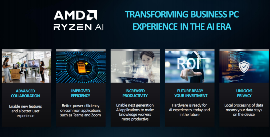 AMD的AI PC解決方案在商用AI領域提供了全新的體驗。第一點,幫助商業用戶實現了更先進的協同工作;第二點,大幅提升能效,在提供優秀的AI體驗的同時實現過往不能企及的低能耗;第三點和第四點互相關聯,核心內容就是生產效率提升且對未來進行技術投資;第五點則是關於用戶的隱私,用戶在PC上實現AI本地處理,這對於關注數據隱私的用戶來說非常重要。