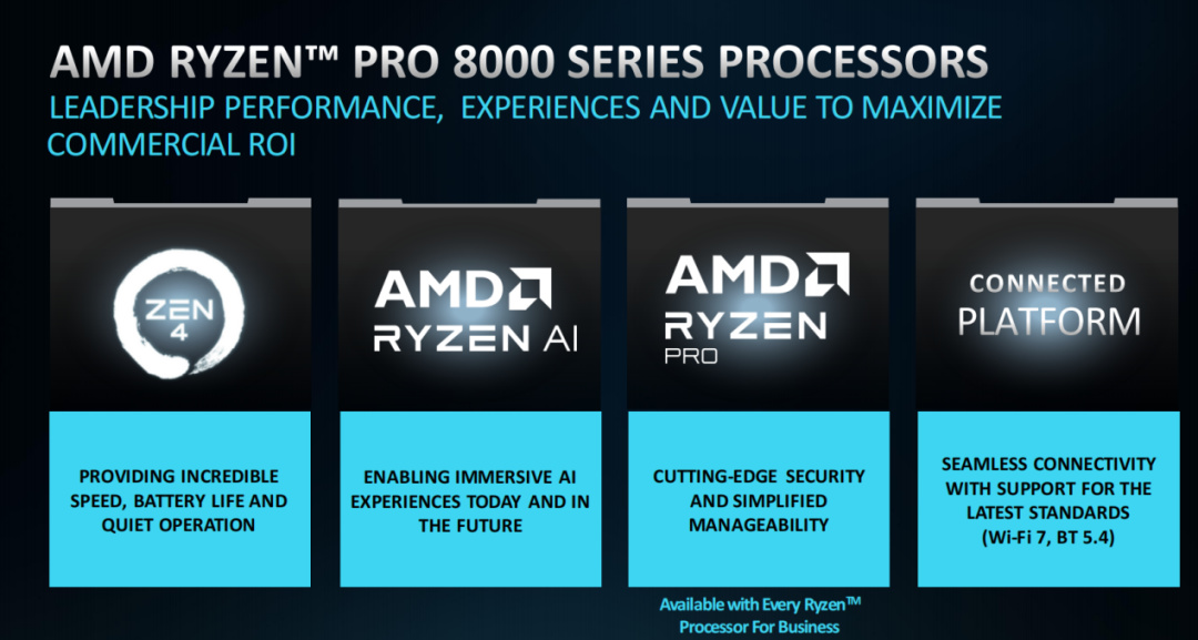 最後簡單總結一下,AMD發佈的全新銳龍PRO 8000/8040系列商用移動與臺式機處理器採用了Zen 4架構,並內置了Ryzen AI引擎,首次將商用PC帶進了AI時代。銳龍PRO 8000/8040系列內置的AMD PRO技術提供了出色的安全性與可管理性,而搭載WIFI 7和藍牙5.4則爲用戶提供了更強大的高速連接功能。同時,AMD還會與超過150個ISV合作,大力發展基於Ryzen AI的生態圈,讓基於AMD方案打造的AI PC能夠發揮更加強大的作用,爲商業用戶提供更高效、更豐富的AI性能體驗。