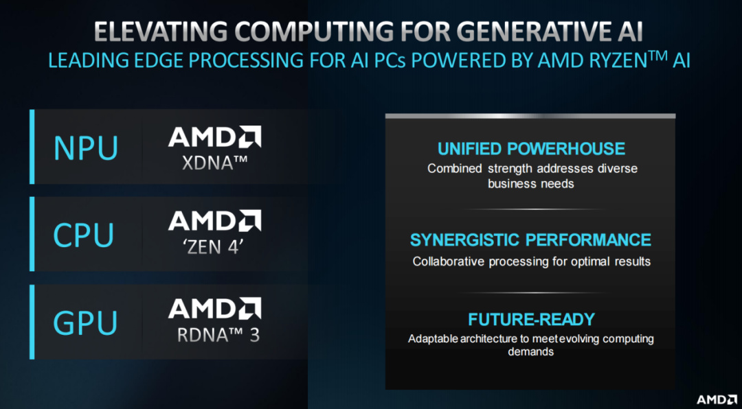 我們知道,AMD的AI PC全面佈局核心祕訣就是Ryzen AI,它由三個要素組成,包括CPU、GPU和NPU。CPU主要是用來處理對響應速度要求比較高的任務;而GPU會重點處理AI工作流;NPU針對的則是傳統PC上沒有辦法完成的AI工作負載。總的來說,Ryzen AI是一個面向未來AI PC的AI解決方案集合。