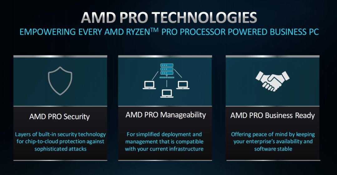 當然,作爲商用產品,銳龍PRO 8000/8040系列也全面支持AMD PRO技術,在安全性、可管理性、商業就緒方面能夠實現部署和管理的簡化,提供更高的可靠性。AMD PRO 安全性方面,AMD與微軟Microsoft Pluton安全產品進行了整合,可以實現更好的安全性。AMD PRO可管理性方面,AMD把過往基於雲端的支持進一步延伸到了臺式機上,對於所有的用戶,包括那些遠程辦公和混合辦公的用戶來說,這是一個非常重要的特性,這意味着IT支持的人員可以爲遠程或者混合式辦公的員工來提供及時的IT支持,它可以簡化整個IT的運維,而且也允許IT的支持人員來採取一些必要的行動,而以往這種行動如果說對方沒有在同一個網絡裏的話是無法實現的。