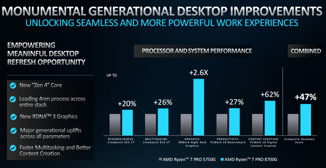 從官方數據來看,銳龍7 PRO 8700G相對上代的銳龍7 PRO 5750G在基準與生產力性能方面有着巨大的性能提升,處理器部分最高提升了62%,GPU方面最高提升了160%,堪稱跨代式飛躍。