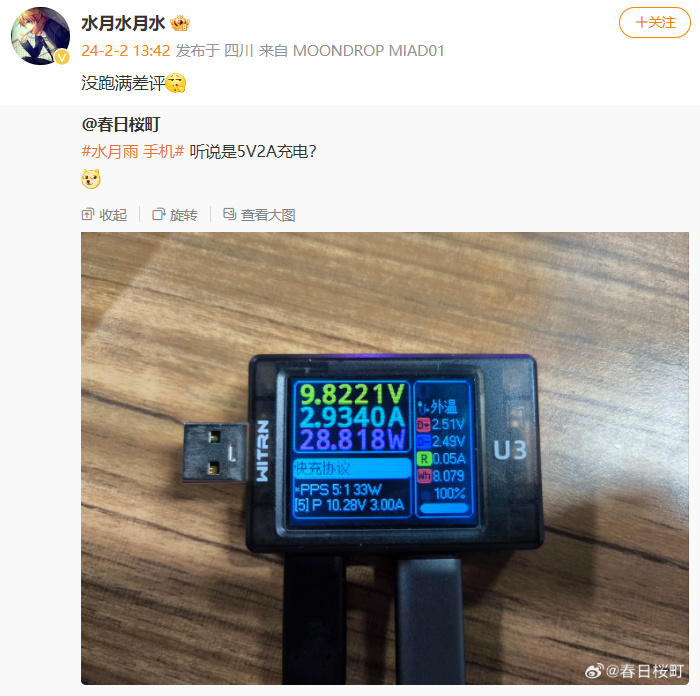 雖然 3C 認證顯示水月雨手機支持 5V 2A 的 10W 充電,但水月雨研發總監 @水月水月水 則表示新機的充電功率會更高。水月雨官方微博也曬出了新機的小尾巴,名爲MOONDROP MIAD01。