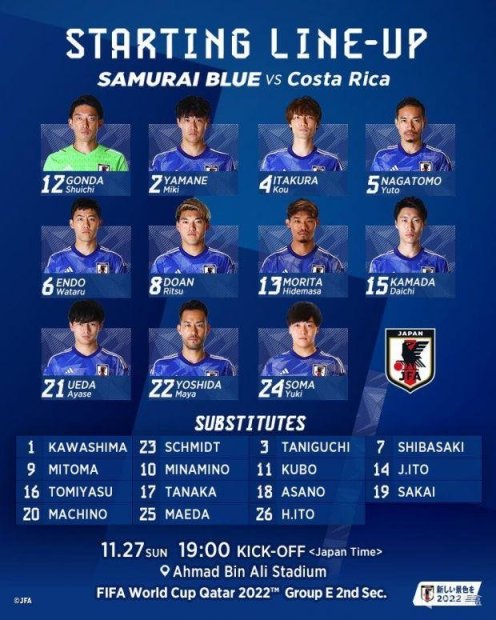 日本替补:1-川岛永嗣、3-谷口彰悟、7-柴崎岳、9-三笘薰、10-南野拓实、11-久保建英、14-伊东纯也、16-富安健洋、17-田中碧、18-浅野拓磨、19-酒井宏树、20-町野修斗、23-丹尼尔-施密特、25-前田大然、26-伊藤洋辉