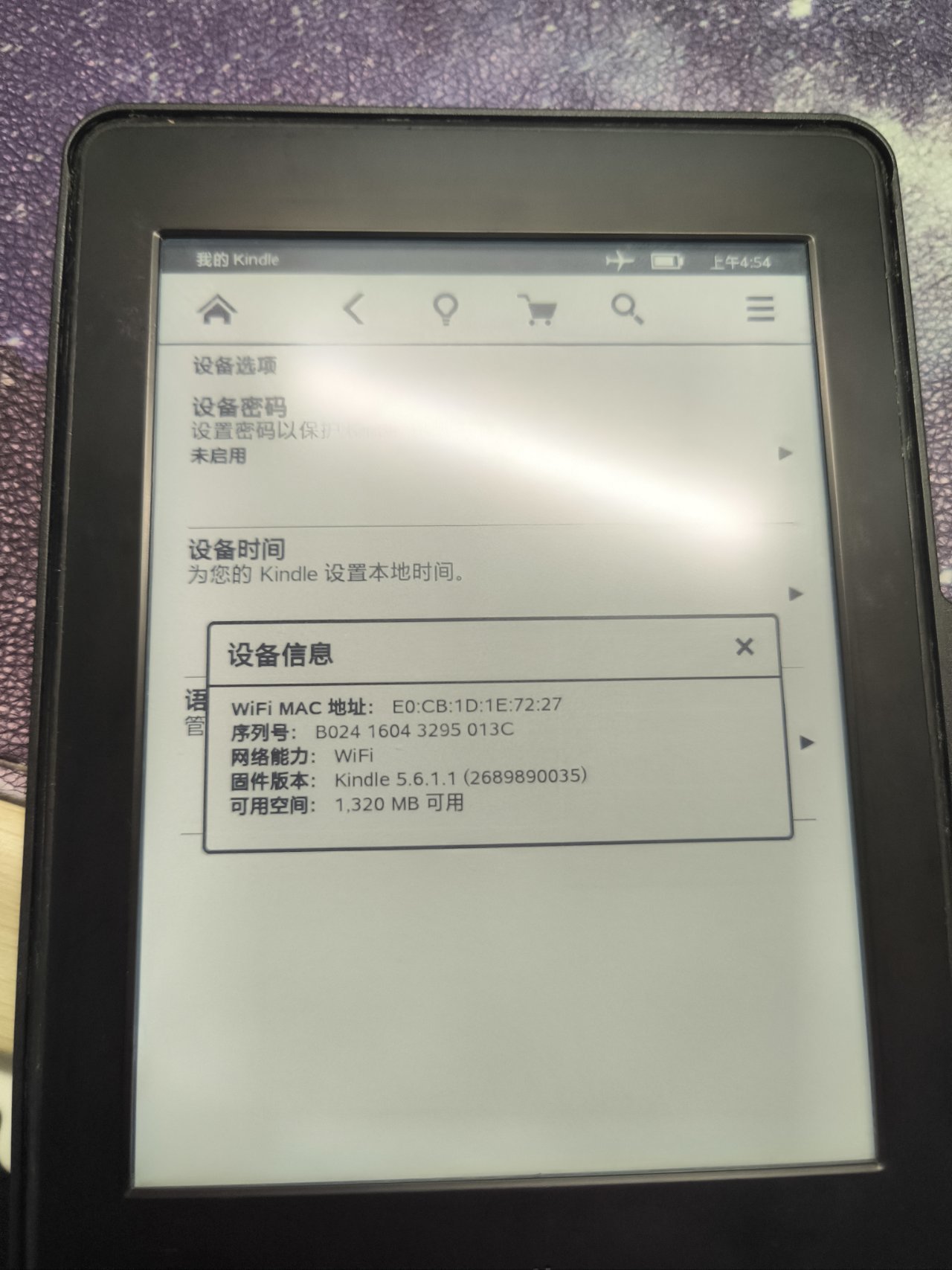通过查询序列号可知这是一台2013年生产的产品,kindle虽然已经退出了中国市场,但好像依旧可以登录以及云端下字典什么的。为了更方便使用,机子拿到手以后,我便进行了越狱操作。