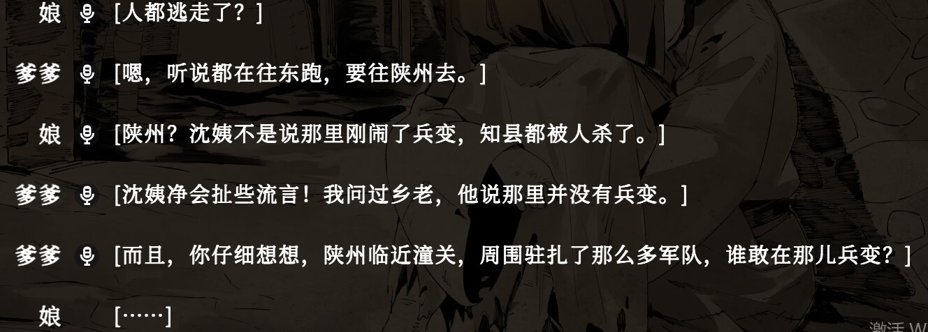 假如你一周目就走到真结局的话,那么前文埋给你的伏笔可以说在随着剧情的推进逐一回收,其震撼感不亚于当时在知音漫客上的短篇上“看见小桃花和桃花源的真相”。但可惜的是笔者在《葬花》时提前看了那个漫画短篇,又有着“RPG先走死路”的习惯导致了在推进《饿殍》假结局时提前被剧透了一波,失去了那种体验感。(点名在第一次遇见闯军时真分支一头雾水但假分支给你提前剧透的情况)这也算制作组涨点经验吧。