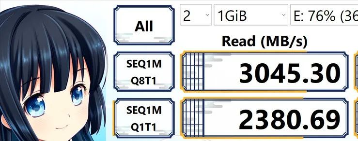 CrystrialDiskMark读写测试 相信已是老生常谈了。在测试中,670p达到了3000MB/s的顺序读写速率,对于一款PCI-E3.0 X4的QLC产品来说,这样的表现并不算差。