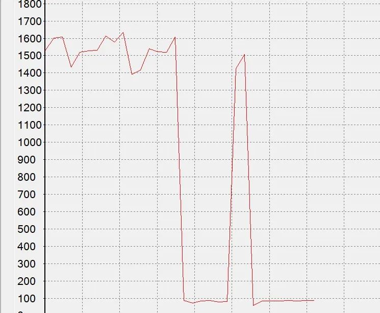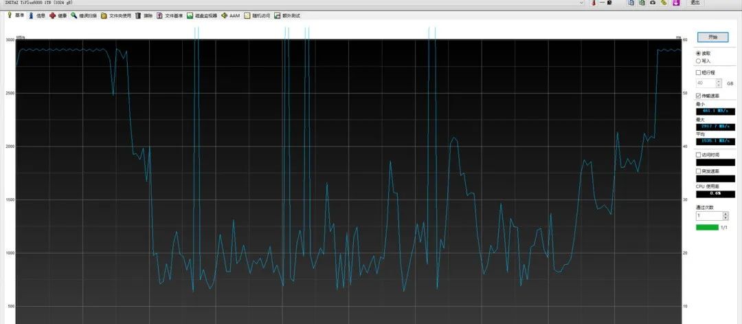 作为对比,一块放在硬盘盒上使用、主要存储较大文件的TLC硬盘 反而出现了严重的“冷数据”情况。它的速率波动极大,并多次下降至300MB/s以下。
