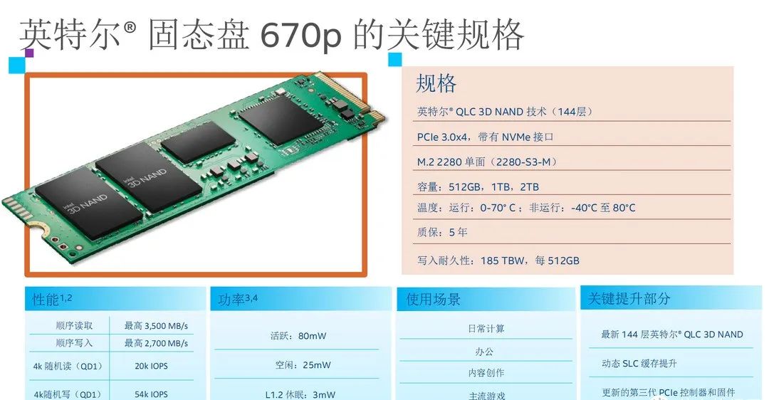是的,你没有看错,英特尔670p的标称电流非常低。在英特尔的宣传资料中,更是出现了“活跃功耗仅80mW”这般惊人的能耗数字。