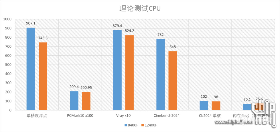 首先是理論性能測試部分,8400F因爲使用了更新的工藝和構架,所以不管是單核還是多核能力上都能戰勝12400F。而且8400F的優勢還延伸到了內存延遲上,比12400F低了5ns延遲
