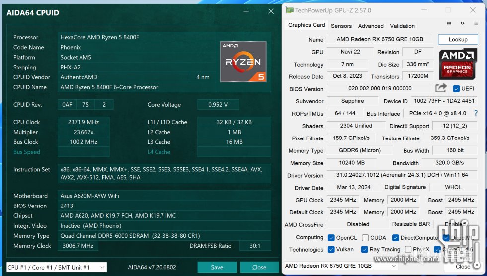 首先全部點亮,可以看到R5 8400F在最新的AIDA64中已經有了詳細的信息,工藝相較於7500F已經升級到了4nm,核心爲6c12t,這個規格也是目前AM5上爲入門級遊戲主機所提供的常見規格,能滿足遊戲和很大一部分日常CPU性能需求。而RX6750GRE 10G在最近更新了24.2.1版本的驅動之後已經擁有了AFMF的特性,3.1版本更加穩定且新增了多個遊戲的支持,價格非常甜品,性能足以2K玩3A,也是性價比拉滿的。內存爲目前入門級AM5平臺常用的6000MHz CL38,這個頻率和延遲的內存價格一般都不會太高,也是非發燒友的首選