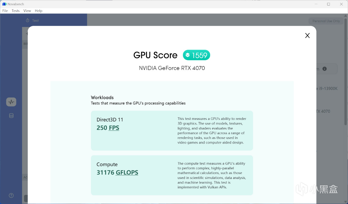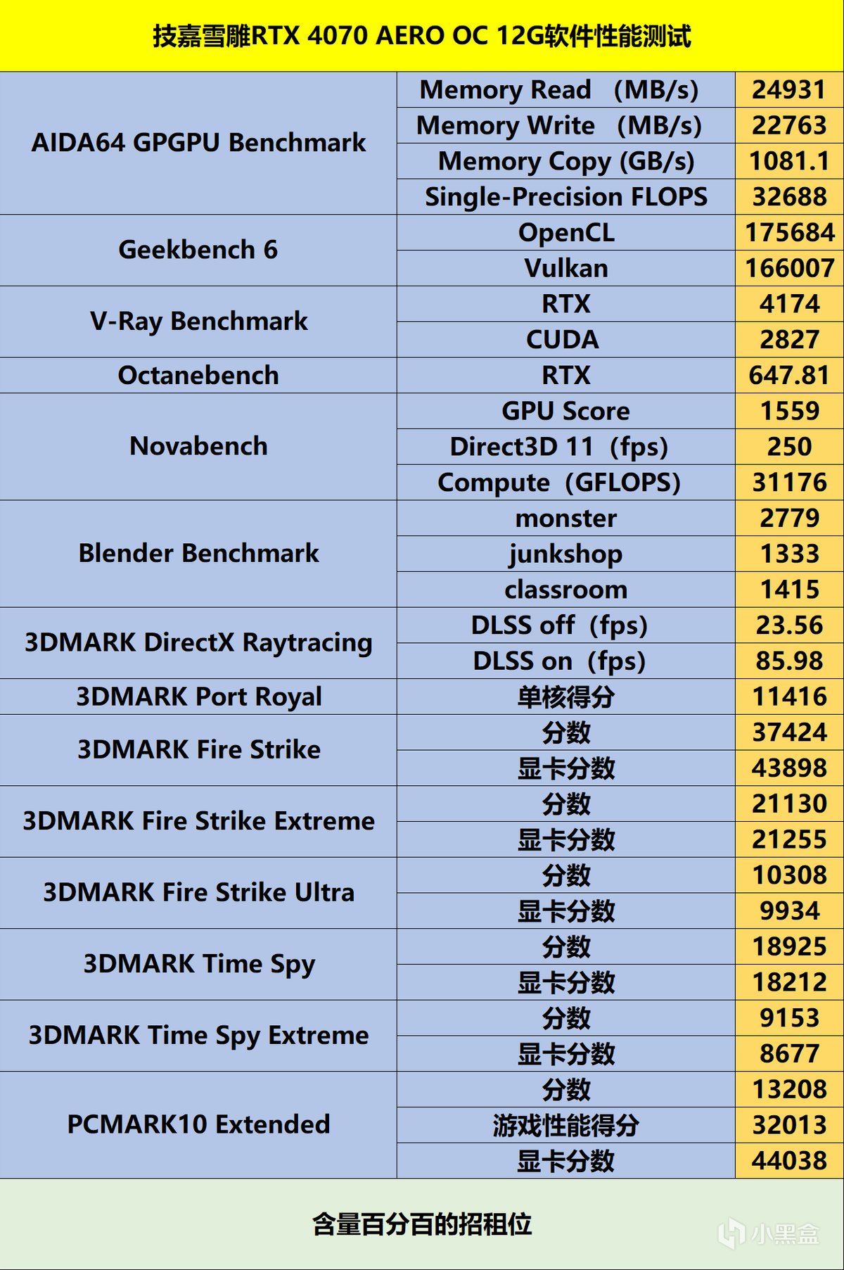 技嘉雪鷹RTX 4070 AERO OC 12G在Novabench下的測試結果爲1559,其中Direct3D 11對應的結果爲250 fps,浮點運算數爲31176 GFLOPS。