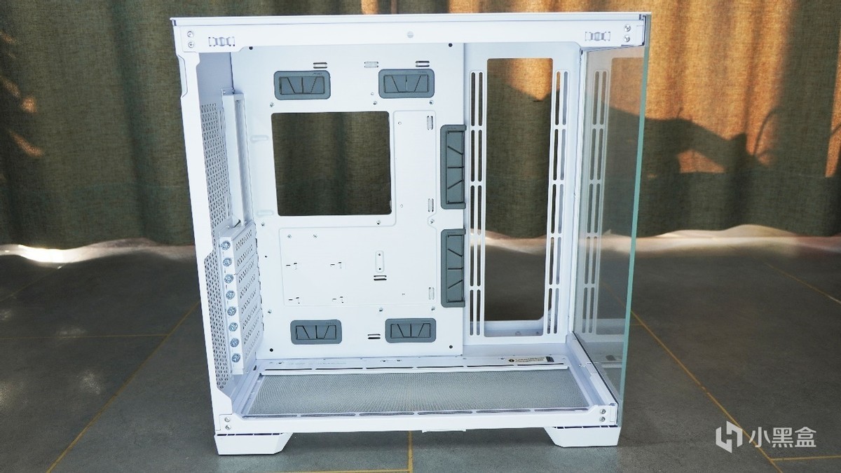 一是頂部除了支持安裝360水冷外,左側風扇/冷排安裝位的內壁到機箱邊緣(內)的深度爲5.6釐米,右側主板內壁到機箱邊緣(內)的深度爲9.3釐米,可見背部有更大的空間來方便線材規整。前側和左側鋼化玻璃面板厚度均爲主流的4毫米,左右兩側面板均採用了免工具拆裝側板設計,更加方便拆裝,而且左側的鋼化玻璃面板採用了無鑽孔設計。