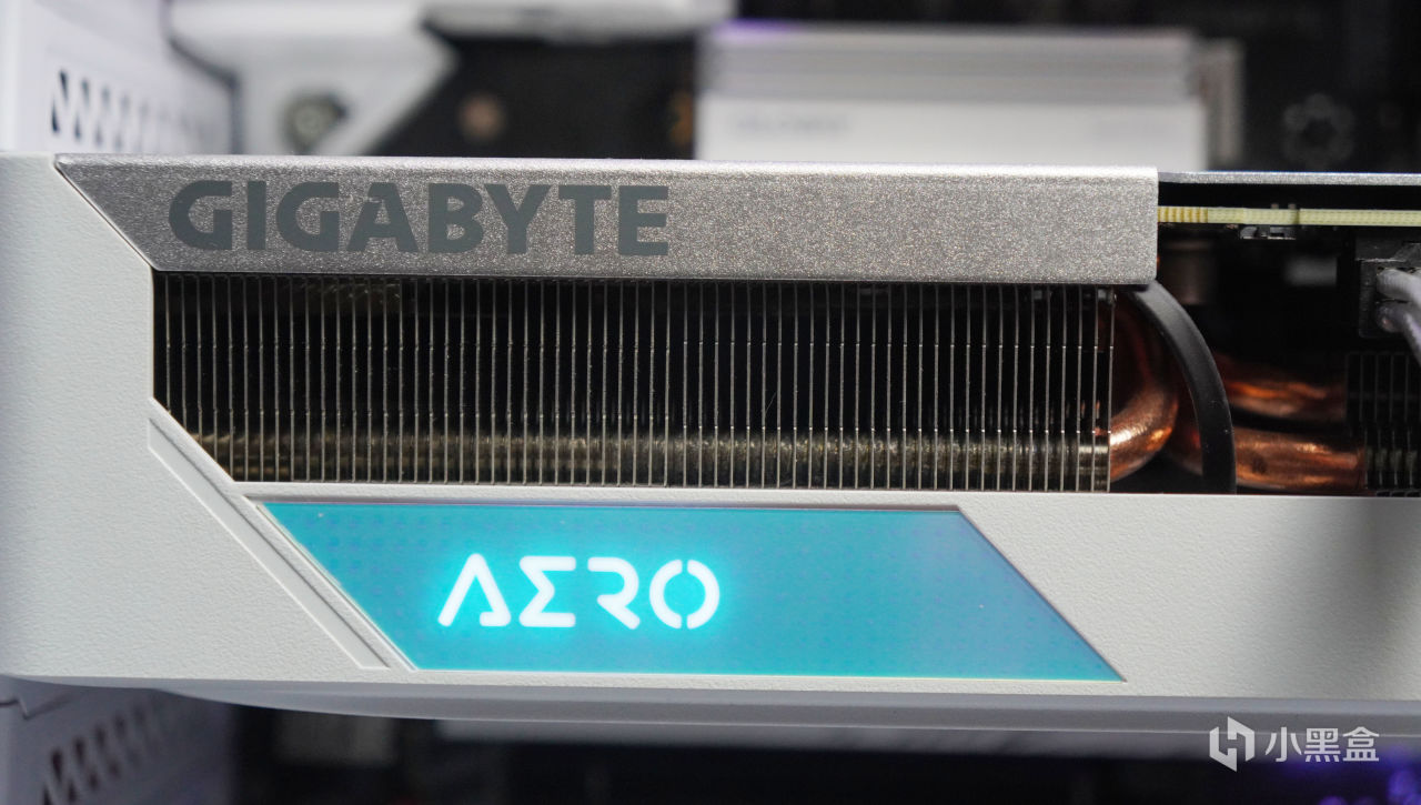 雪鷹 RTX 4070 AERO OC 12G側面左下角Aero字樣的位置設計了一塊鐳射漸變區,不同角度可以看到不一樣的色彩,而且這個區域還加入了背景燈設計,支持1670萬色燈效以及燈光同步,可以通過技嘉智能管家(GCC)選擇其他燈光效果或與其他設備同步來提升顯示效果。如果面積更大一些或是加入LCD屏顯示的話,效果會更高。