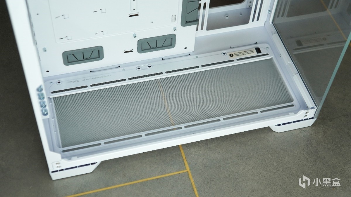 二是安鈦克C8海景房底部取消了電源倉設計以及硬盤架設計,變爲了風扇安裝位或是水冷安裝位,支持360水冷安裝,也支持3個14釐米或是2個160釐米風扇安裝,不過需要注意的是底部默認不支持安裝12釐米風扇,需要安裝配件包裏面的風扇轉接架。