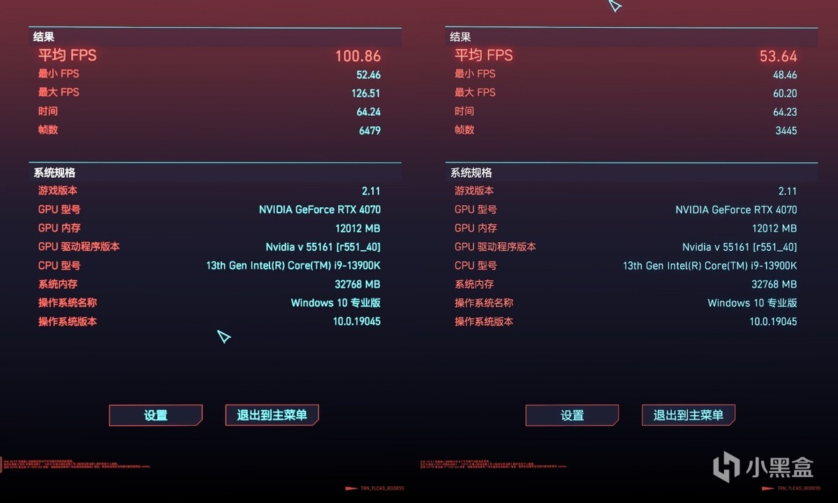 再來看看《賽博朋克 2077》(Cyberpunk 2077),這裏選擇的是快速預設方案“光線追蹤: 超級”+ DLSS 光線重構:開+光線追蹤光照:超級,技嘉雪鷹RTX 4070 AERO OC 12G在2560*1440分辨率下的平均幀率爲100.86fps,在3840*2160分辨率下的平均幀率爲53.64fps。
