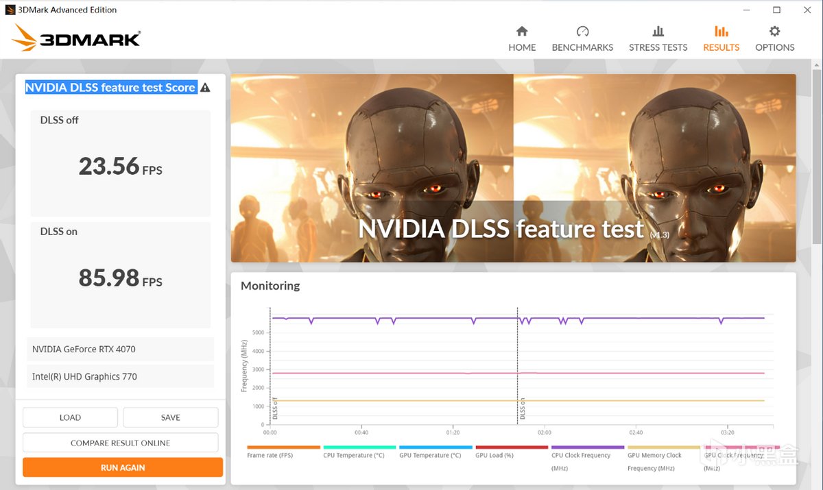 技嘉雪鷹RTX 4070 AERO OC 12G在3DMARK DirectX Raytracing下的測試結果如下,DLSS off對應的測試數據僅爲23.56fps,DLSS on對應的測試數據爲85.98fps。