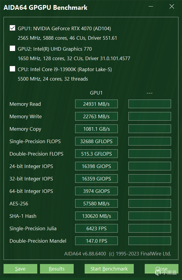 技嘉雪鷹RTX 4070 AERO OC 12G在AIDA64 GPGPU Benchmark下的測試結果如下, Memory Read對應的數據爲24931MB/s,Memory Write對應的數據爲22763MB/s,Memory Copy對應的數據爲1081.1GB/s,Single-Precision FLOPS爲32688 GFLOPS。