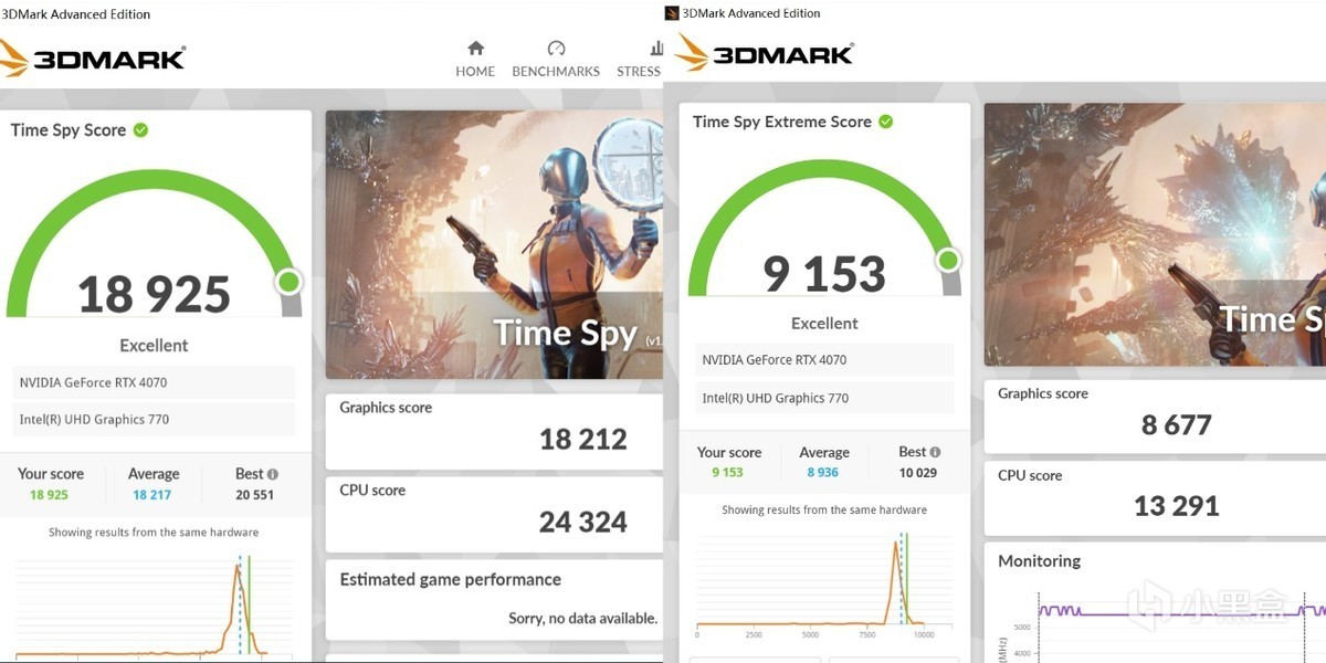 技嘉雪鷹RTX 4070 AERO OC 12G在Time Spy下的得分爲18925,其中顯卡得分爲18212;在Time Spy Extreme下的得分爲9153,其中顯卡得分爲8677。