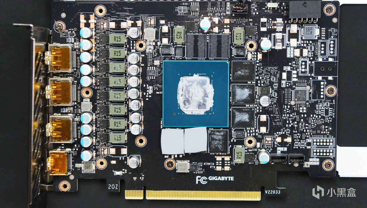 我們再來仔細看看散熱的部分,銅板是直接接觸到了顯存核心,再加上8根複合式熱管以及散熱片來提供更高的導熱效率,與風冷散熱器的設計類似。對應顯存和電容等部分也都有加入固態導熱硅脂片。