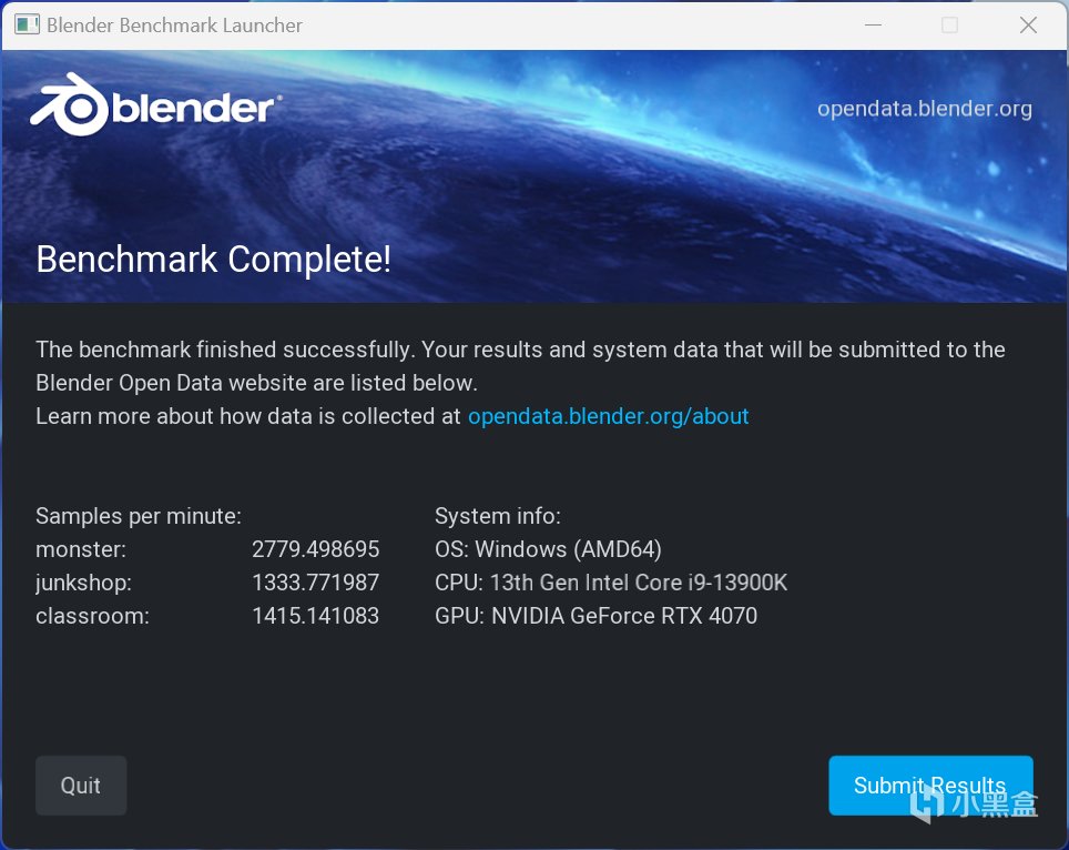 技嘉雪鷹RTX 4070 AERO OC 12G在Blender Benchmark下的測試結果分別如下,monster對應2779,junkshop對應1333,classroom對應1415.