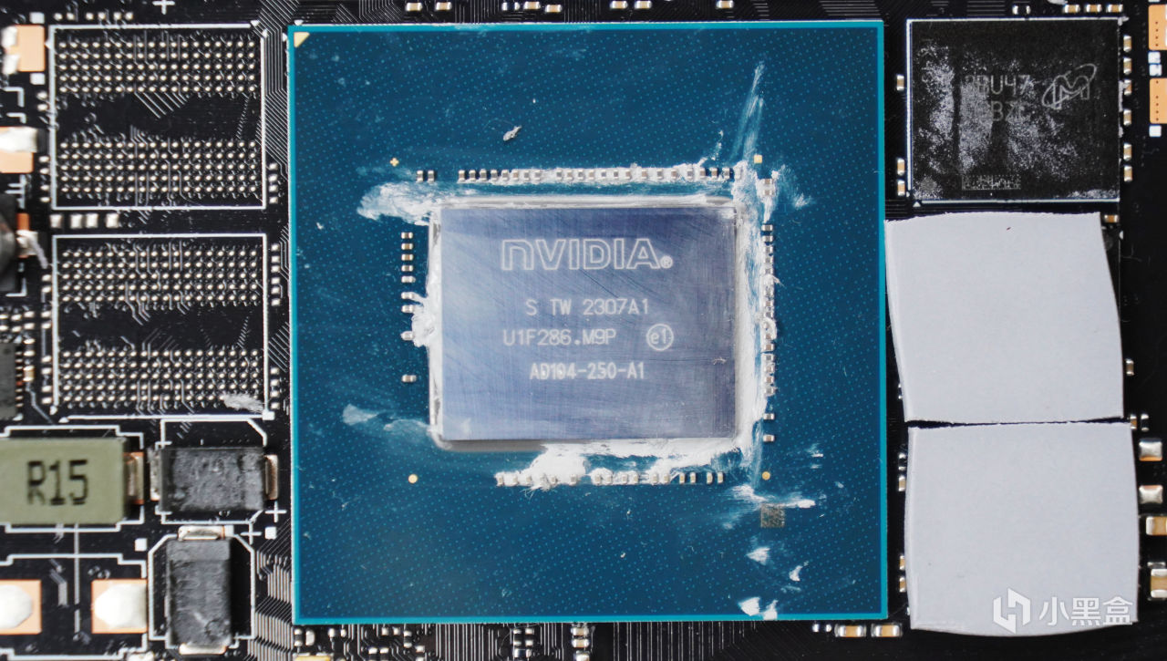 中央位置就是搭載AD104-250-A1的芯片,右側和上方的6個黑色模塊就是美光GDDR6X顯存,單顆顯存容量爲2GB,型號就是3CU47 D8BZC。上方應該也是預留的兩個顯存位置。