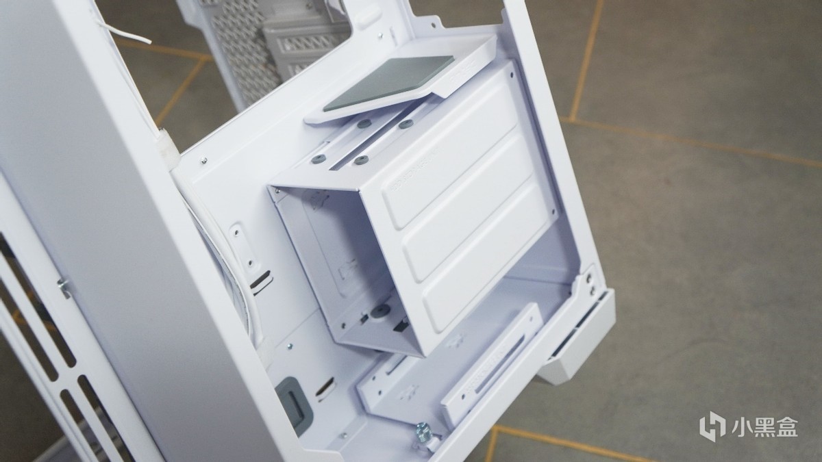 三是電源倉和硬盤架則是設計在了背部側面的位置,位於主板安裝位下方,方型硬盤架上方那個帶灰色橡膠墊的金屬板就是電源安裝位,方型硬盤架支持2塊3.5英寸HDD硬盤安裝但不支持2.5英寸硬盤安裝,此外在頂部和底部設計有2個支持2.5英寸硬盤的快拆板。