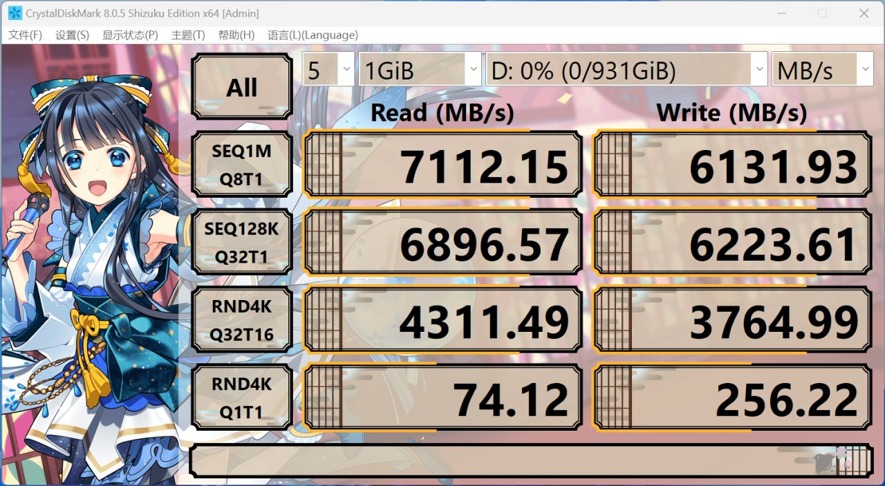 通过CrystalDiskMark测试佰维NV7200 1TB SSD默认随机模式下的数据,在默认随机模式下得到连续读取速度为7112MB/s、连续写入速度为6131MB/s 。而在单队列单线程4K小文件极端情况的读写性能测试中读取速度为74MB/s,写入速度为256MB/s。