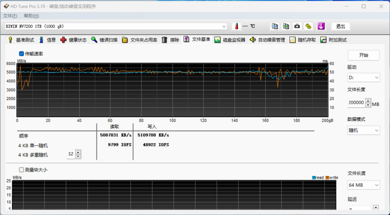 接下来我们使用HD Tune Pro测试佰维NV7200 1TB SSD SLC Cache,数据模式选取随机,将数据块大小定为200GB,可以看到在单个200GB大小文件块传输下,无论是读写都十分平稳不掉速,这说明佰维NV7200 SSD的主控性能表现十分稳定。