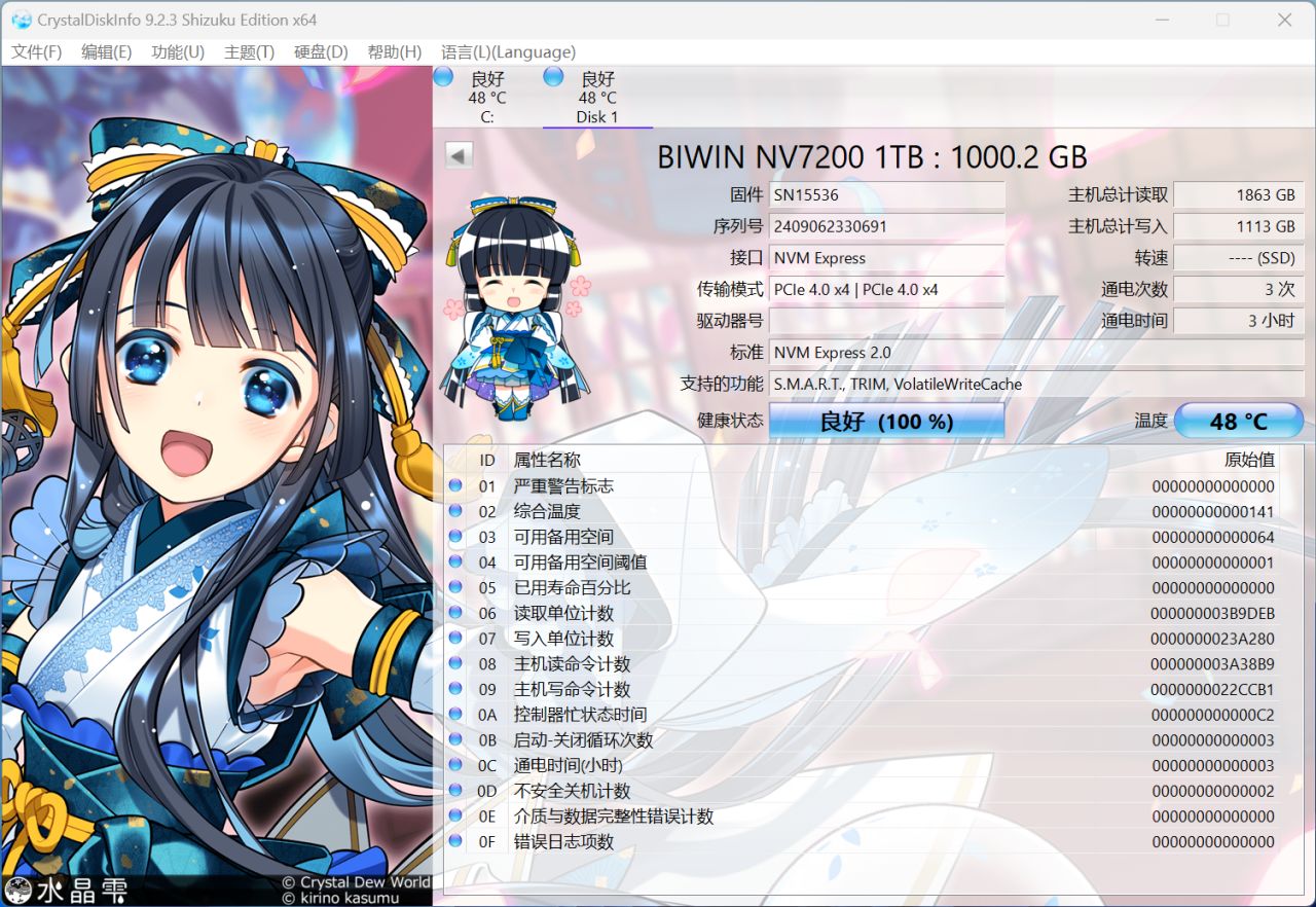 首先来看看佰维NV7200 1TB硬盘的参数,我们使用CrystalDiskinfo查看可以得知,它采用PCIe Gen4X4规格,标准为NVMe 2.0,支持S.M.A.R.T.,TRIM,VolatileWriteCache等功能。