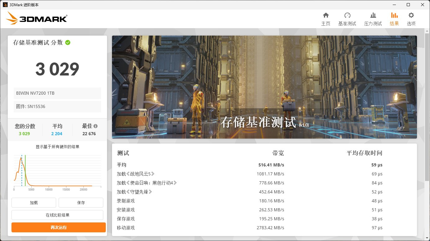 佰维NV7200在3DMark存储得分为3029,平均传输速率为516MB/s,延迟为59us,其中加载游戏这块表现也很好。加载《战地风云5》速度为1081MB/s,加载《使命召唤:黑色行动4》为778MB/s,加载《守望先锋》为452MB/s。