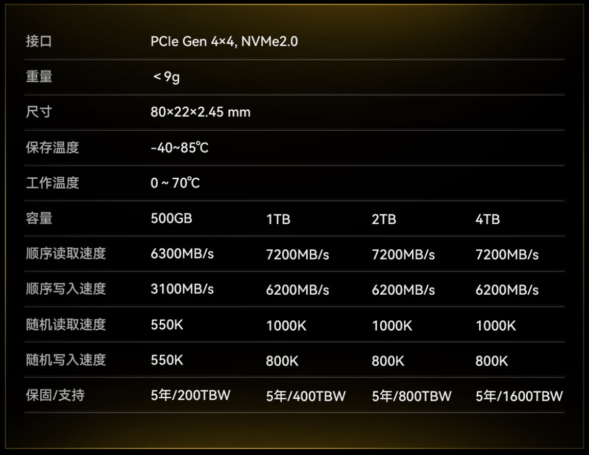 2、容量有500GB、1TB、2TB、4TB可供选择,均是5年保修,根据容量不同TBW也有不同,500GB、1T、2T、4T分别是5年/200TBW,5年/400TBW,5年/800TBW,5年/1600TBW,这个数据可以说是极为不错。