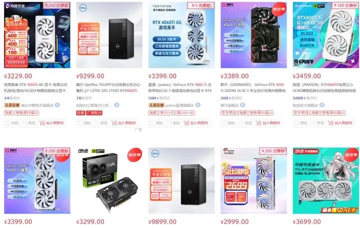 該顯卡就是RX6750XT 12G的一個小換皮,不能說一模一樣,只能說毫無差別,其性能對標英偉達2K分辨率的顯卡RTX4060TI,先看看N卡價格: