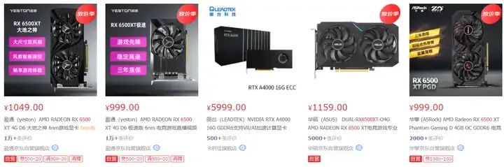 6500XT某東自營價格在1000元左右出頭:
