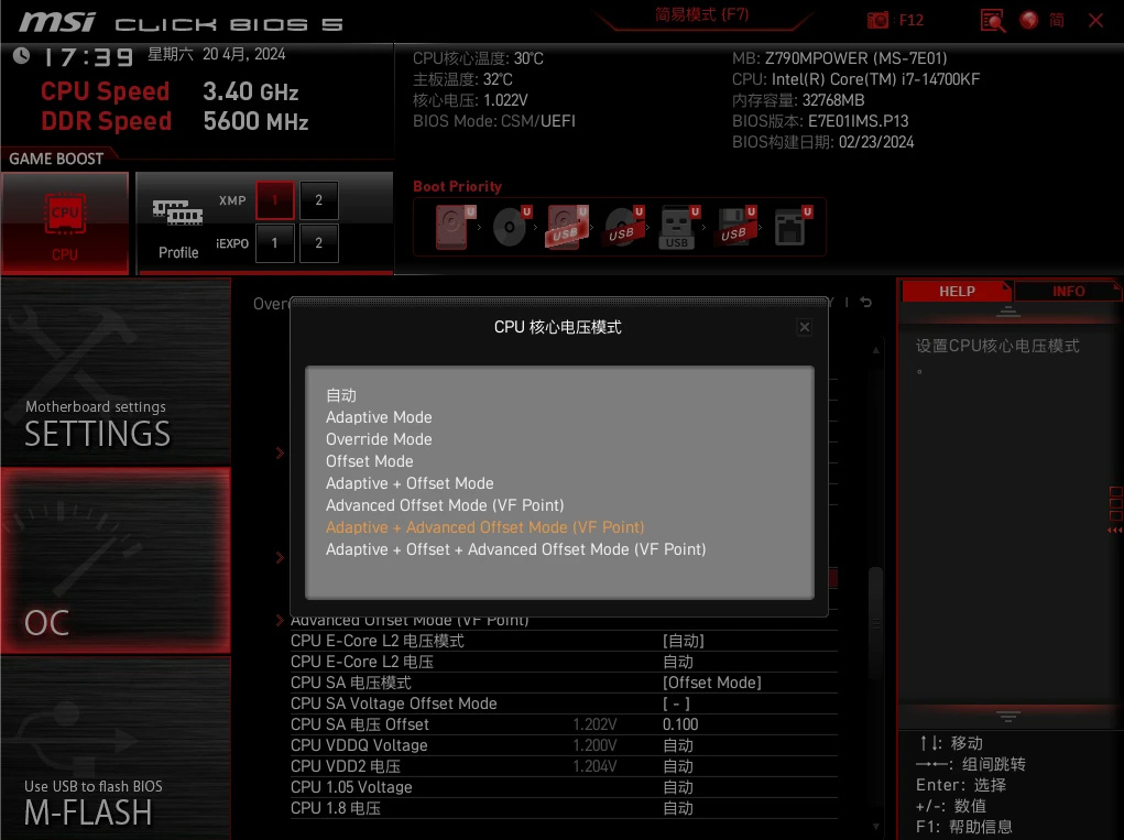 因为我使用的是微星MPG Z790 EDGE TI MAX WIFI刀锋钛主板,如果你对这个温度表现还不满意,还能通过MSI的黑科技给这枚I7进一步降温。你可以进入BIOS开启微码,设置CPU LITE曲线,并微调电压。