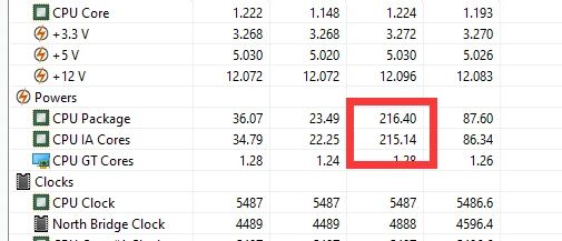此时再次进行FPU烤机,可以看到处理器的最大功耗已经下降到了215-216W的水平,功耗大大降低了。