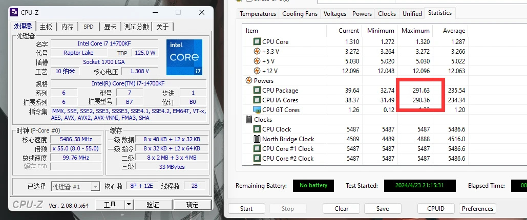 处理器此时最大功耗保持在291W左右,非常惊人。风扇在满负荷工作状态下依然非常安静,得益于风扇框架结构和减震胶垫设计,没有震动和异响,只有风噪的声音。