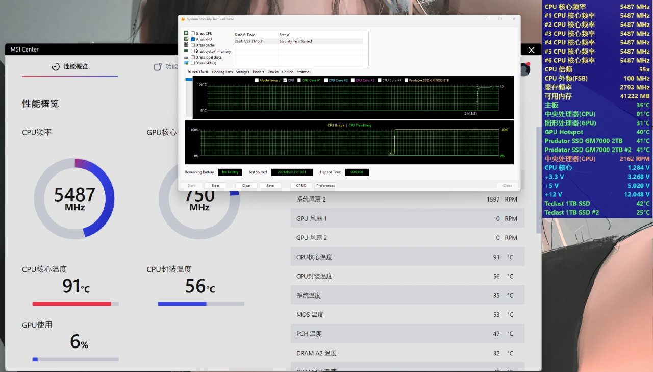 开启FPU进行压力测试,3分钟后可以看到处理器还是稳定在91摄氏度。
